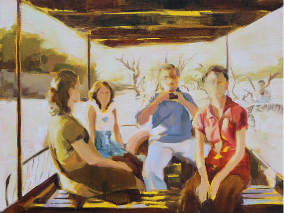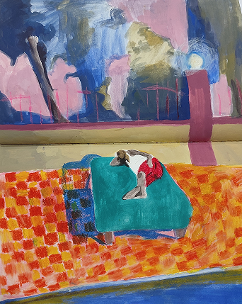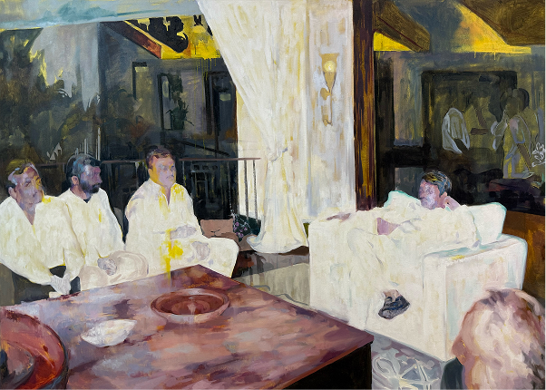 In an age where digital connections often replace physical presence, her interest in portraiture and figuration explores the tension between intimacy and distance in virtual interactions. She translates digital stills, including video calls, internet images, and family archives, into tactile compositions using acrylic, gouache, mixed media on raw cloth, and oil on canvas. Her recent work is rooted in familial and social realities, especially the dichotomy between public and private selves, and the personal and political. A recurring figure in her visual lexicon is her father, a politician whose public image she contrasts with scenes of domestic life, capturing middle-class mundanities and unguarded moments.