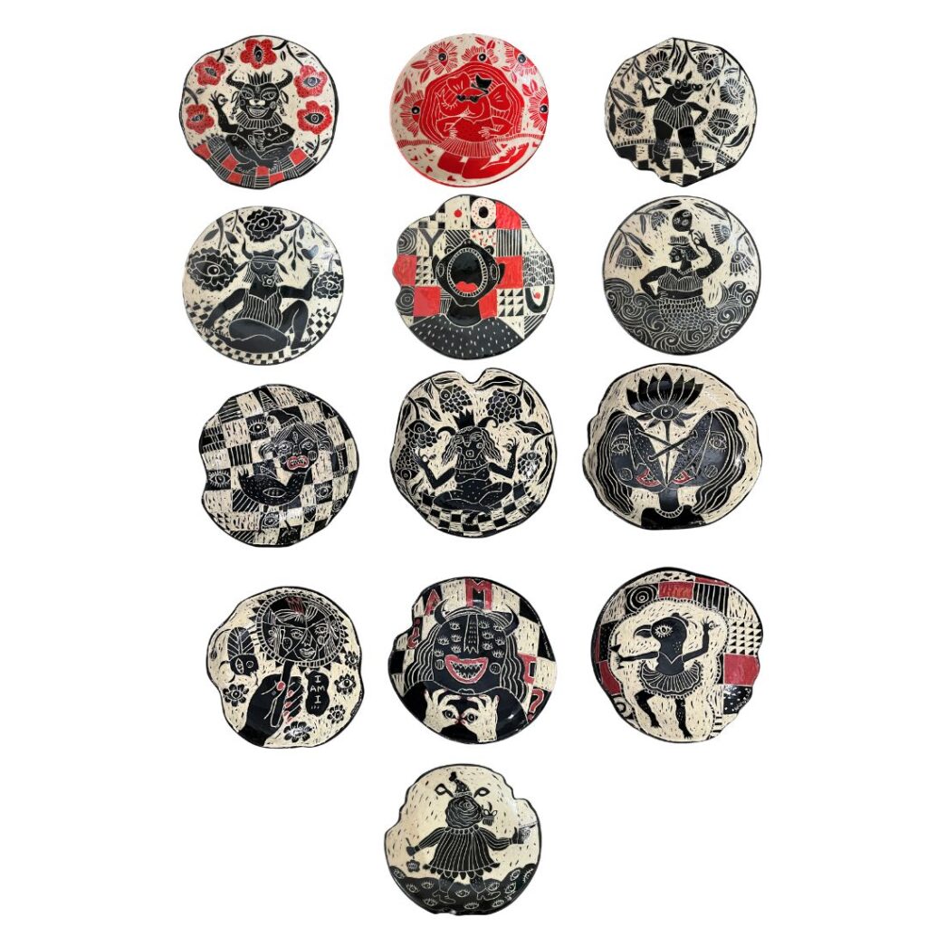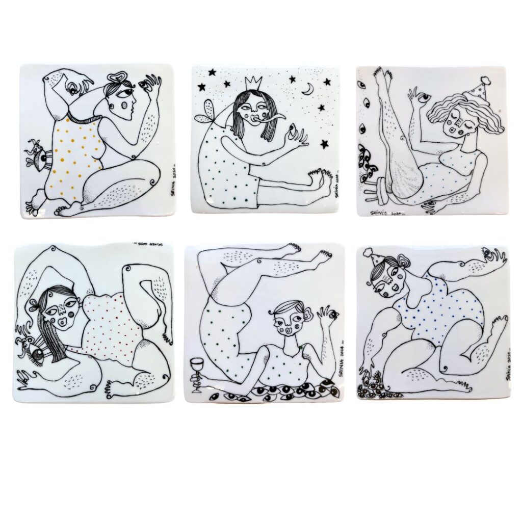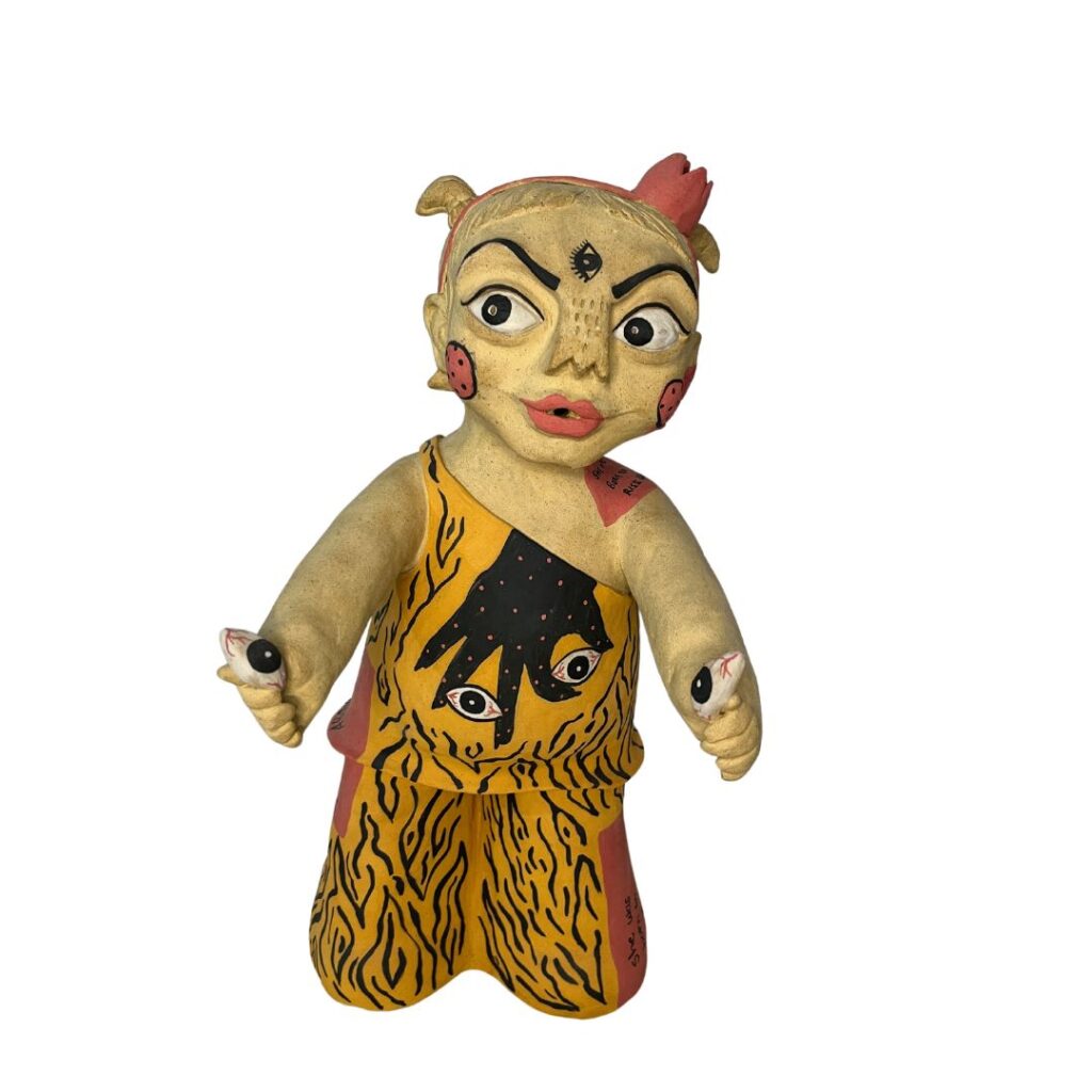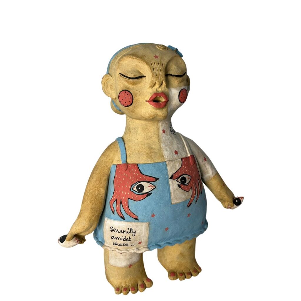 Her practice is focused on satirical commentary, challenging gender stereotypes and advocating for self-acceptance as a rebellious act, reflecting upon the contrast between her carefree childhood and the dichotomy of social expectations as an adult. Influenced by Pop-art, Picasso, and the Bengal School of Art, Srinia’s art is characterized by expressive clay modeling in a distinctly illustrative style and the bold use of colours.